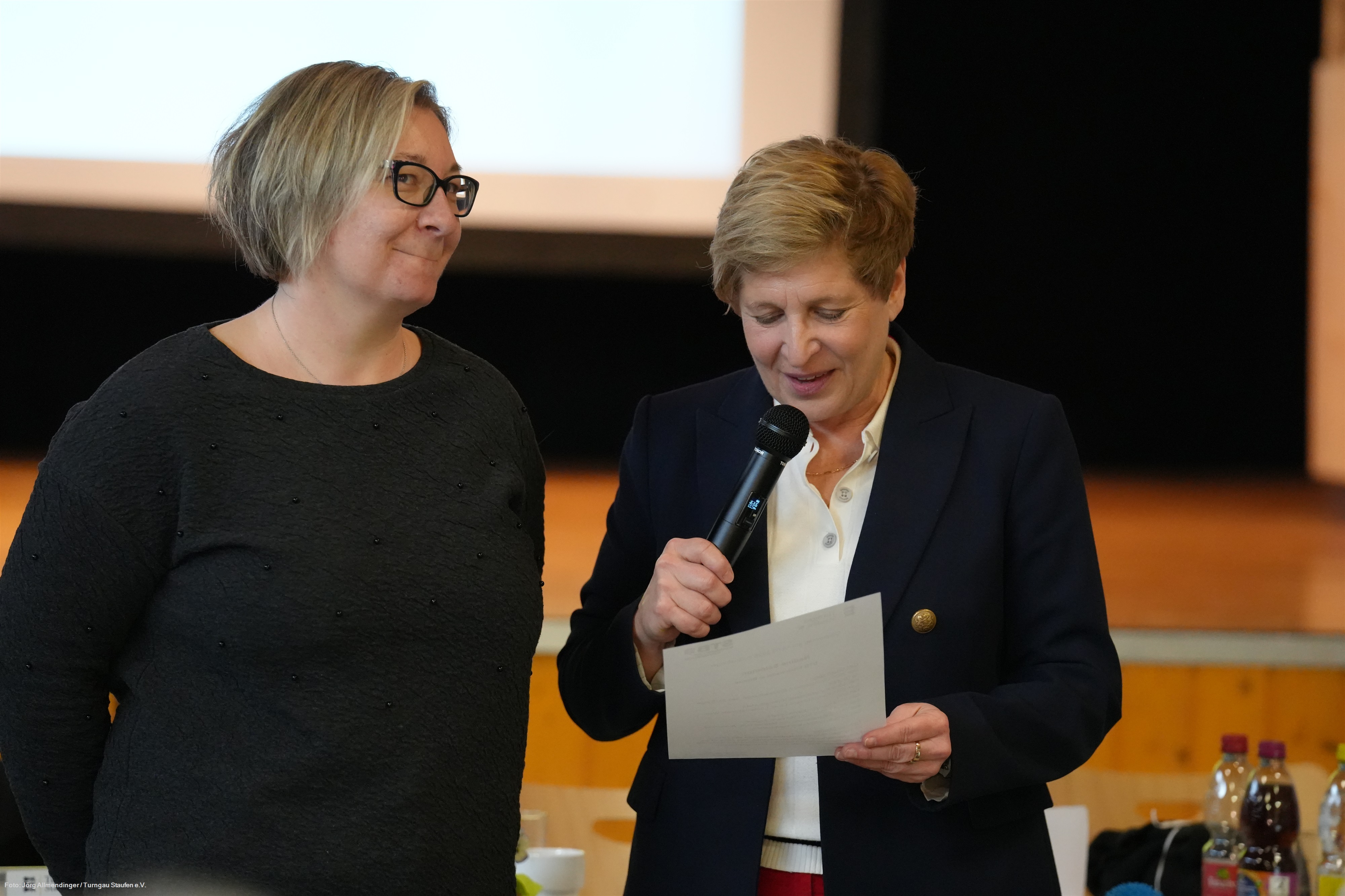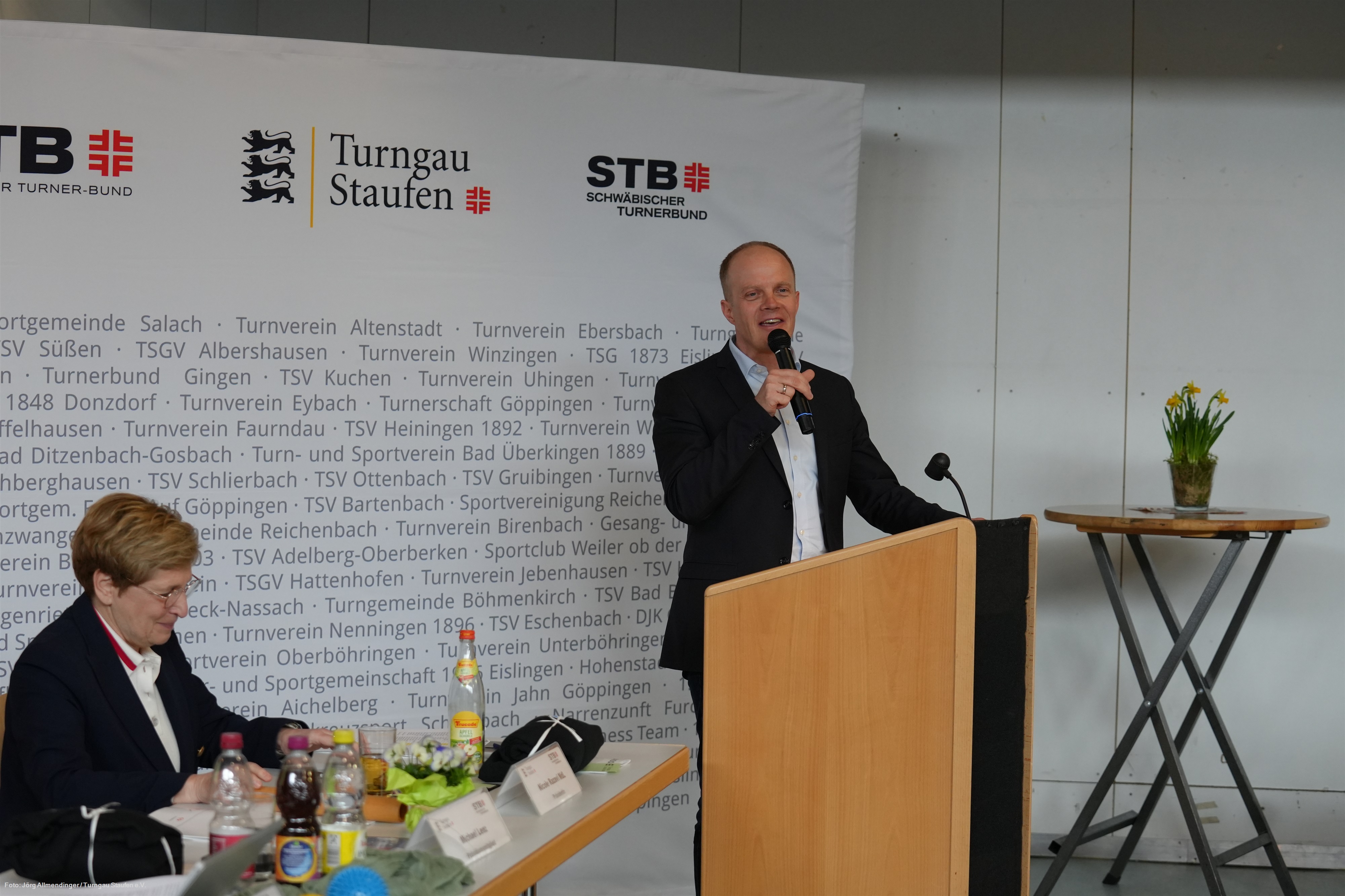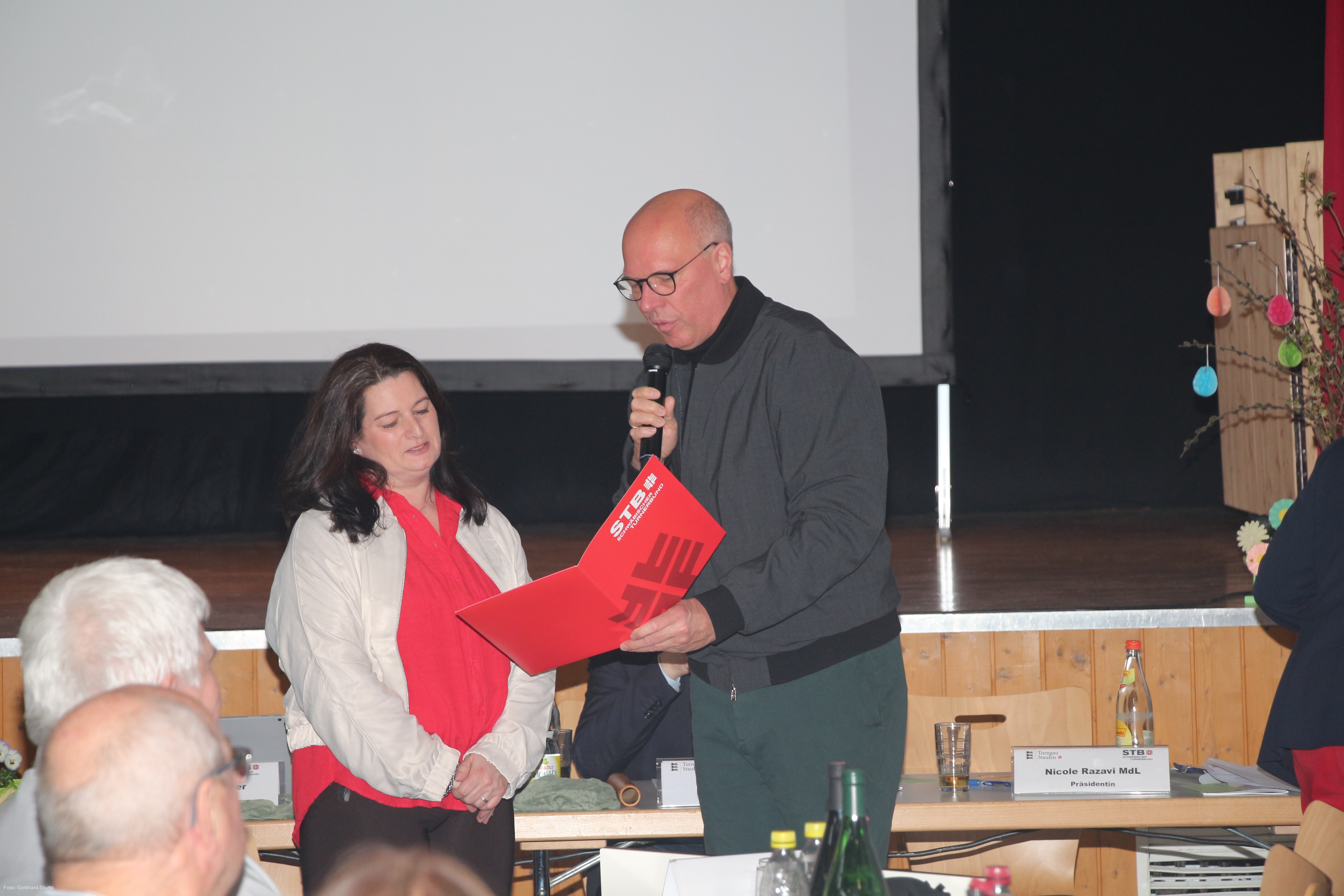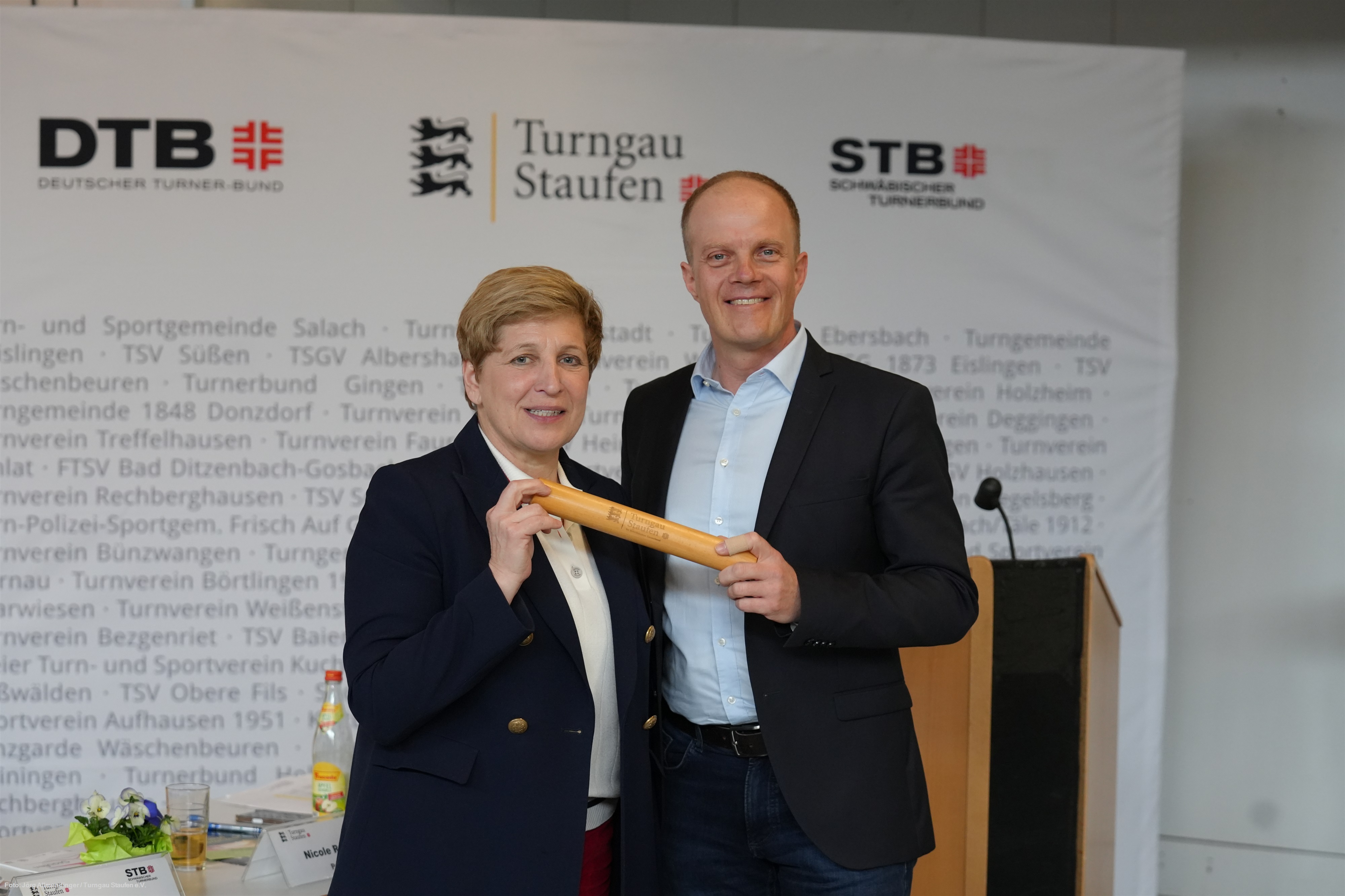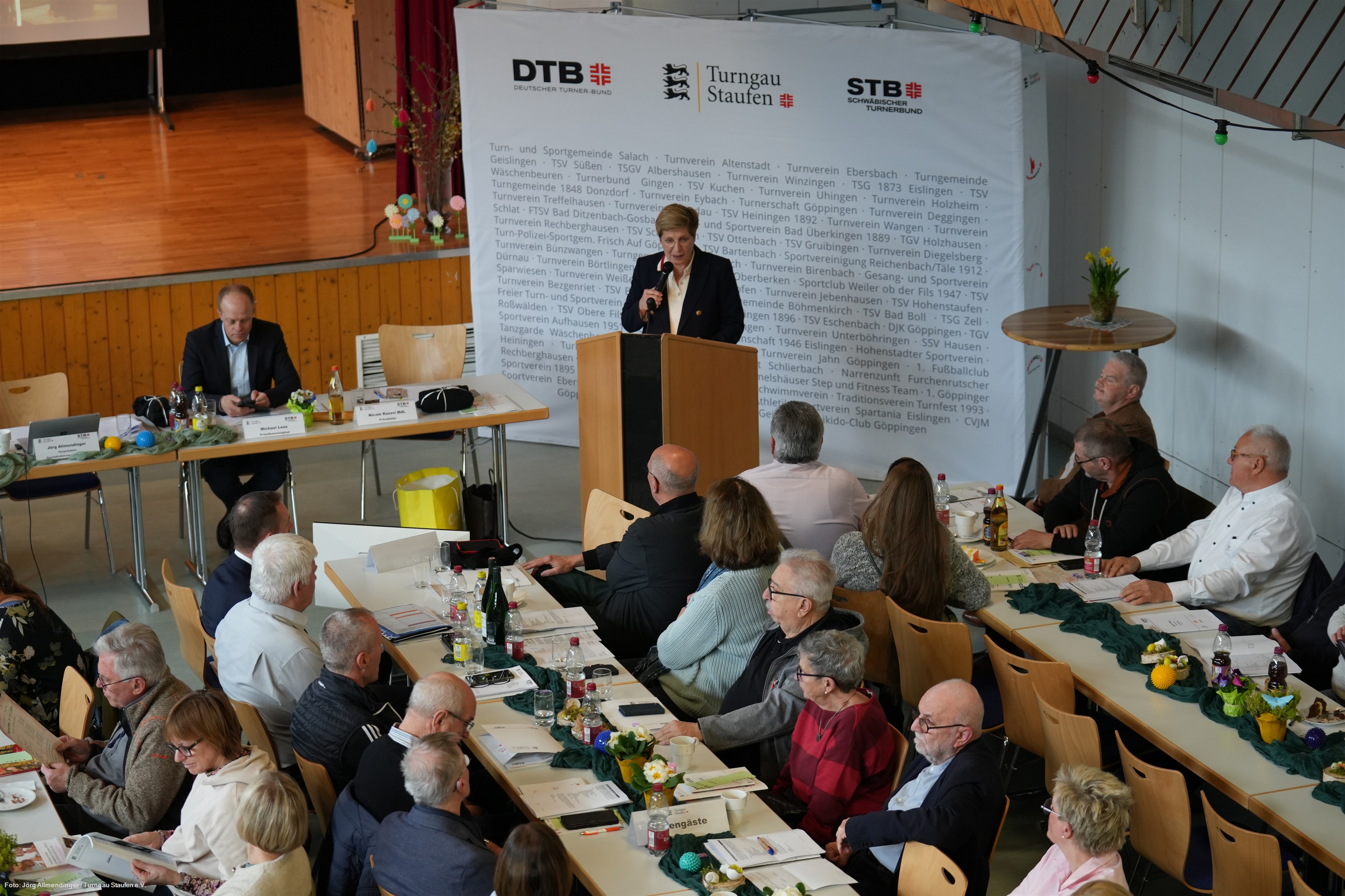 Die neu ernannten Ehrenmitglieder Nicole Razavi und Martin Sauer mit den anderen Ehrenmitgliedern und den Mitgliedern des Turngau-Hauptausschusses auf der Bühne der TSV-HalleBeim Gauturntag, der jährlichen Delegiertenversammlung des Turngaues Staufen, am 14. März 2026 in der Turnhalle des TSV Gruibingen wurde der Lautersteiner Bürgermeister Michael Lenz einstimmig als neuer Präsident des Turngaues Staufen gewählt. Nicole Razavi hatte nach 19 Jahren in diesem Amt nicht mehr kandidiert und wurde von der Versammlung ebenso wie der bisherige Turnwart Natursport Martin Sauer zum Ehrenmitglied ernannt.