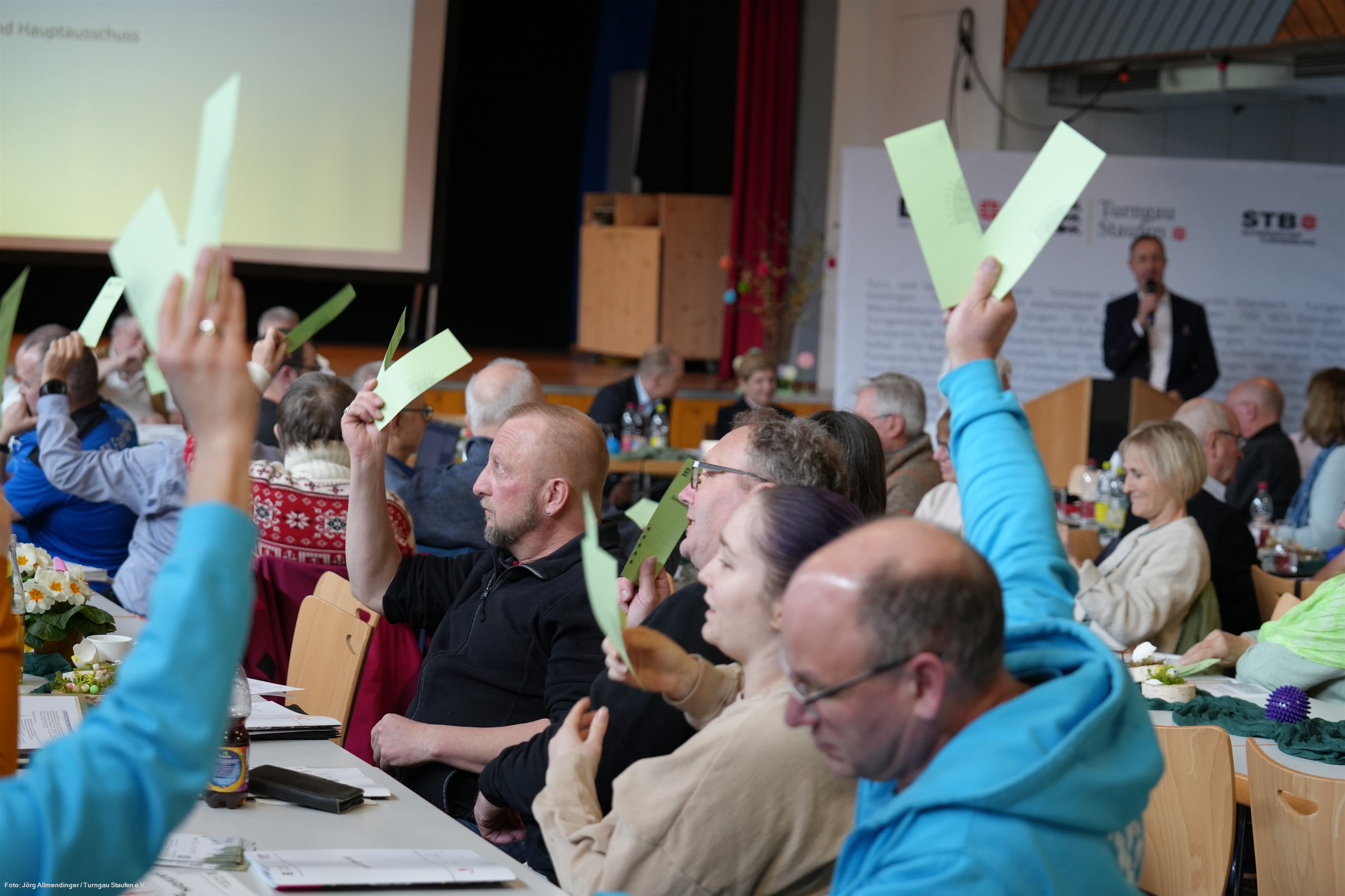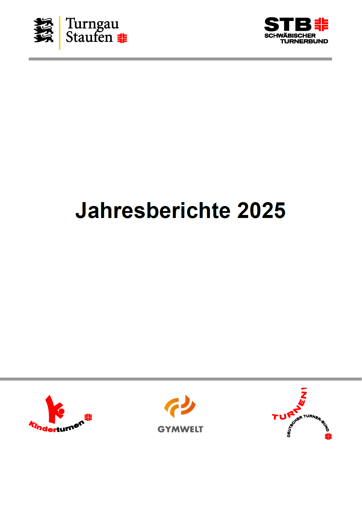 Titelseite des JahresberichtsheftsBeim Gauturntag am 14. März 2026 haben 40 stimmberechtigte Delegierte 27 Mitgliedsvereine vertreten. Dazu kamen 11 Delegierte der Turngaujugend sowie 14 Mitglieder von Präsidium und Hauptausschuss und 4 Ehrenmitglieder des Turngaues Staufen. Insgesamt waren 69 anwesende Personen mit genau 100 Stimmen stimmberechtigt. Alle Mitgliedsvereine, ihre Delegierten und alle anderen stimmberechtigten Mitglieder des Gauturntags haben vorab einen Link zum Download des Jahresberichtshefts 2025 als PDF-Datei erhalten. Die beim Gauturntag anwesenden haben das Berichtsheft außerdem bei der Ausgabe der Stimmkarten als gedruckte Broschüre erhalten. Heute wurde nun die Jahresberichtsheft-Broschüre zusätzlich an die Geschäftsstellen aller Mitgliedsvereine und der Turngaue im STB sowie des Schwäbischen Turnerbunds selbst verschickt. Weitere Broschüren sind bei Bedarf in der Geschäftsstelle des Turngaues (für Vorstandsmitglieder der Mitgliedsvereine kostenfrei) erhältlich.
